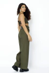 Calça com modelagem wide leg confeccionada em tecido de sarja lisa sem transparência. O modelo de cintura alta possui elástico no cós, bolsos frontais, passantes e acabamento com pesponto branco que dá um estilo único na peça. A peça afina a silhueta, alonga as pernas visualmente e suas variantes verde musgo e preto são cores clássicas fáceis de combinar,